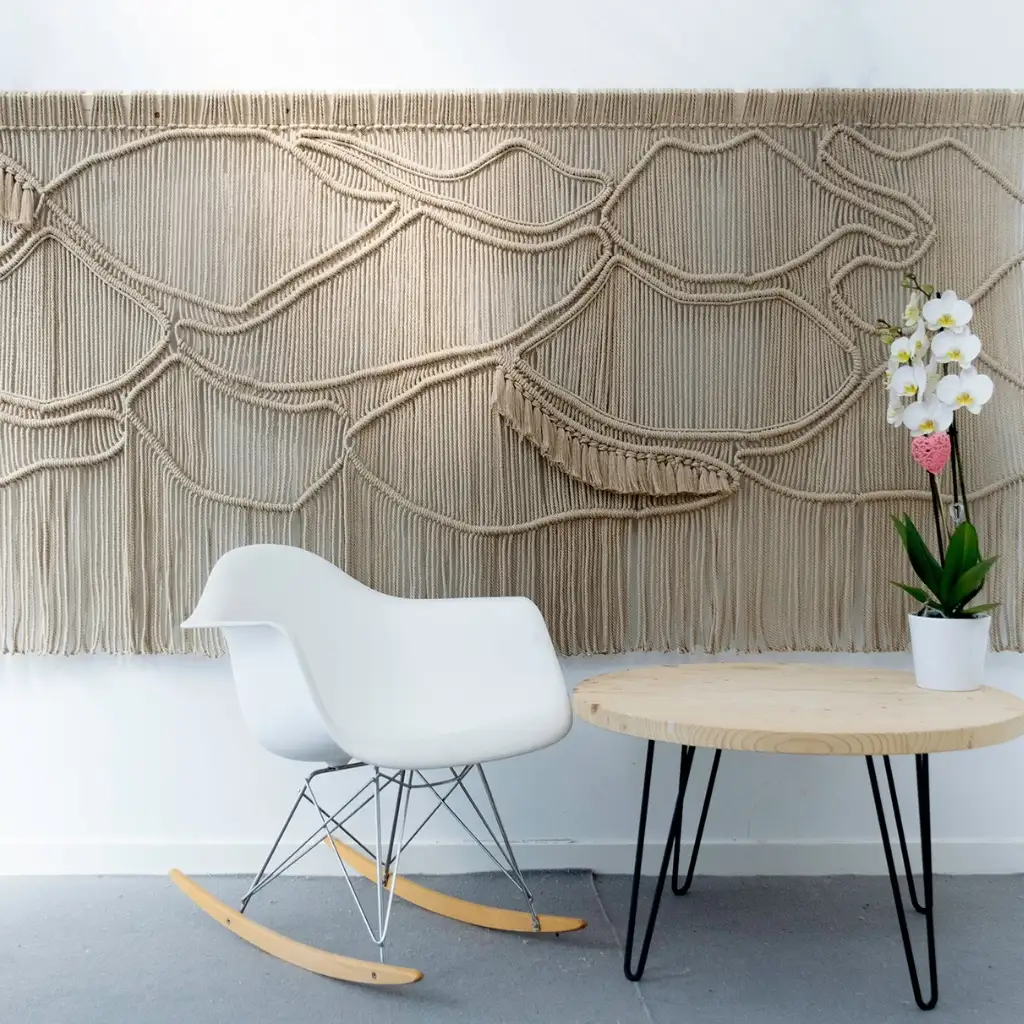 La cuerda está elaborada con algodón reciclado certificado, suave al tacto, fácil de manejar y con un trenzado que garantiza nudos firmes, flecos uniformes y una presencia impecable en cada creación.
