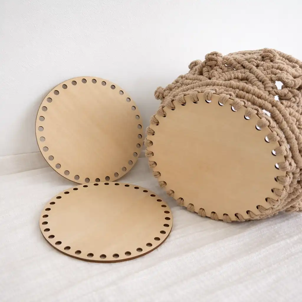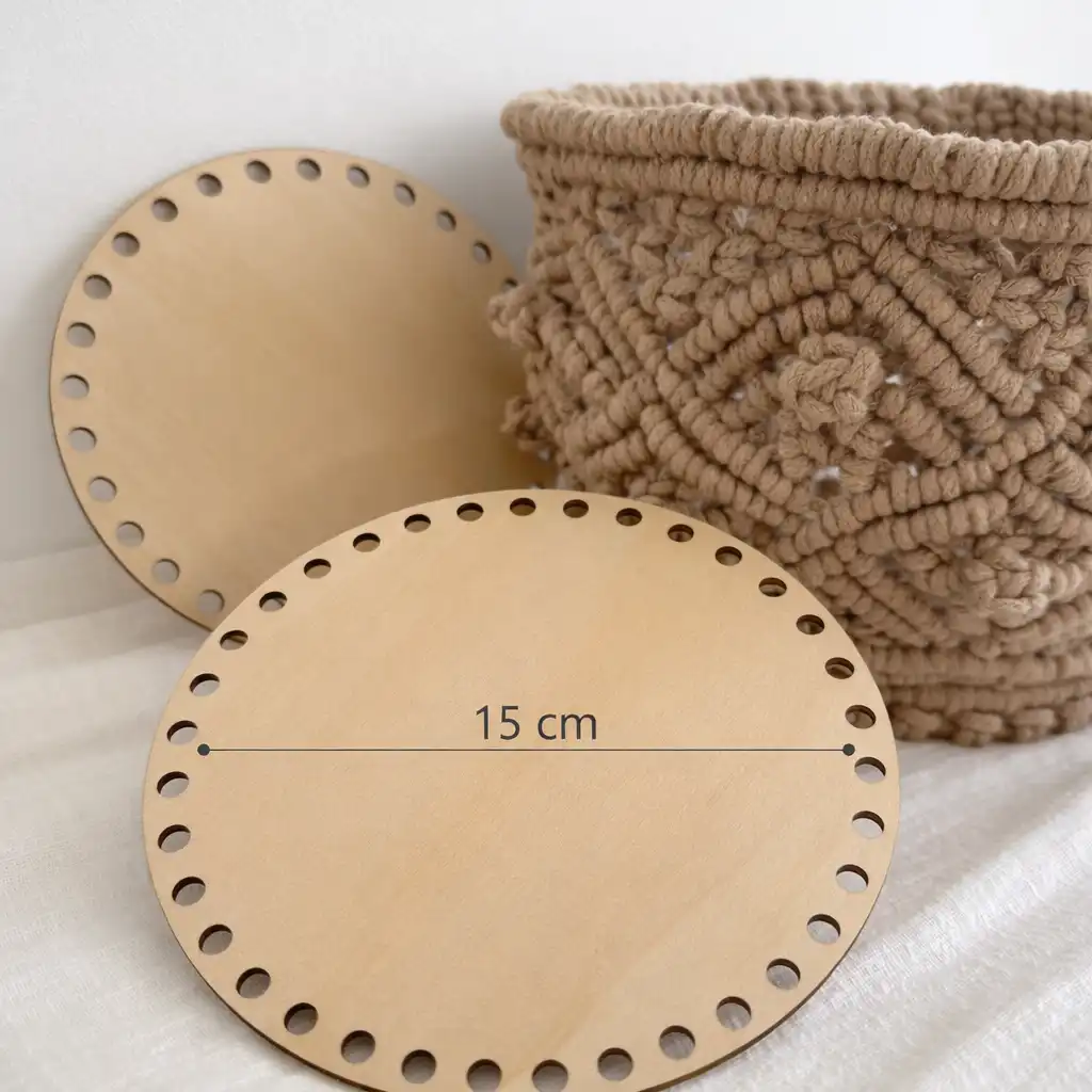 Esta base redonda perforada de madera natural está diseñada para aportar estabilidad desde la primera vuelta. Sus perforaciones uniformes permiten insertar cuerda, cordón o trapillo con precisión, manteniendo una tensión constante y un acabado limpio.