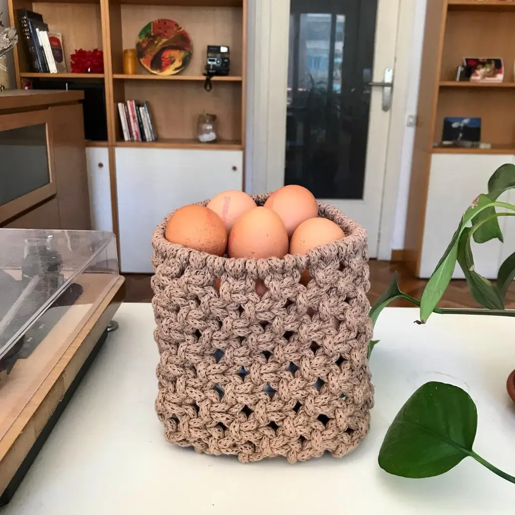 El proyecto incluye acceso al curso dentro de Macrademia®, donde podrás ver el curso express siempre que lo necesites y resolver tus dudas en el foro. Aunque no tengas experiencia previa, notarás desde el primer minuto cómo tu mente se relaja, cómo tus manos encuentran el ritmo y cómo la pieza crece casi sin darte cuenta. Muchas alumnas lo describen como un pequeño ejercicio de nudoterapia para volver a ti misma. Es el “Cesto de los Huevos”