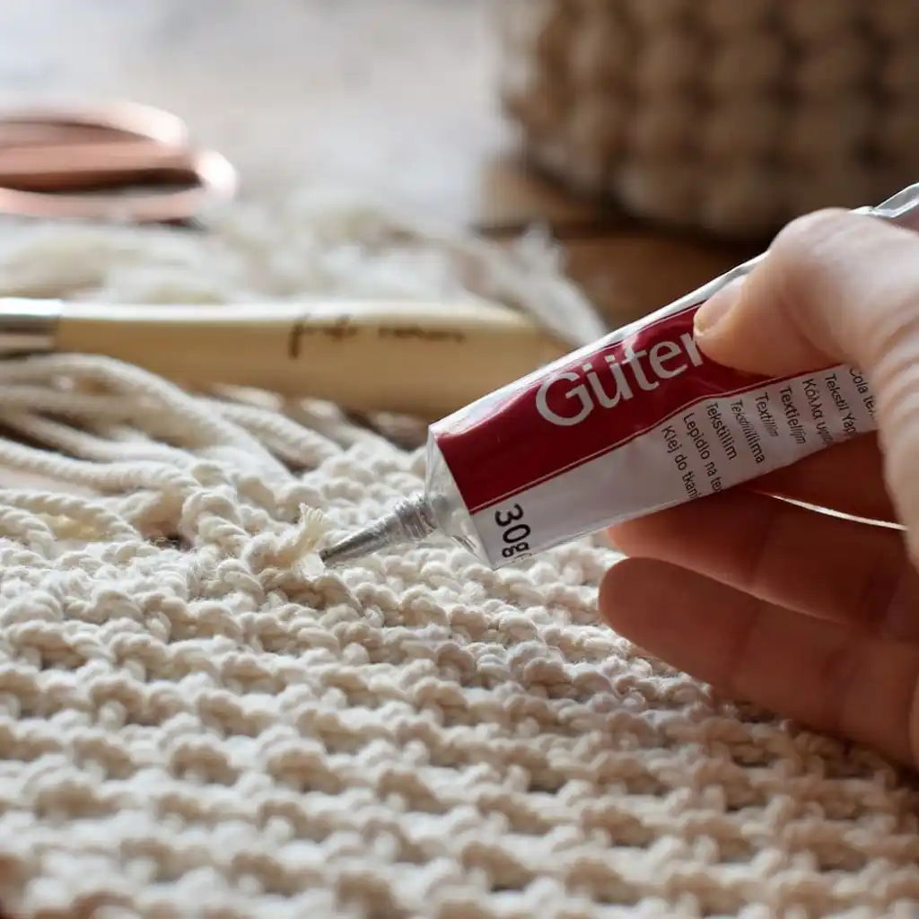 Este pegamento textil transparente fija sin coser, mantiene la elasticidad del tejido y deja un acabado limpio y profesional en cada proyecto de macramé o textil creativo.